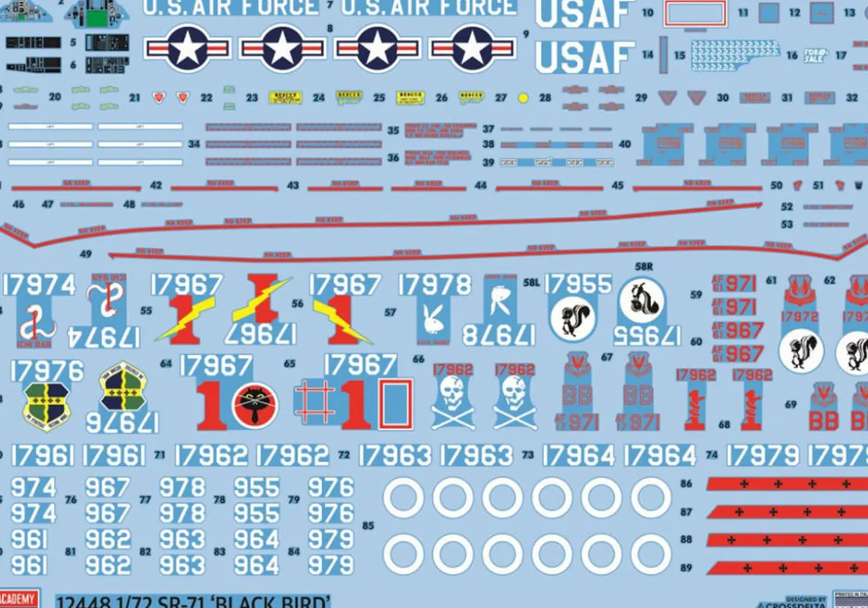 The Academy 1/72 Lockheed SR-71 Blackbird from our 1/72 scale aircraft model kits range accurately recreates the real-life US Cold War spy plane. This plastic model kit requires paint and glue to complete.Markings by Cartograf for 12 aircraft: