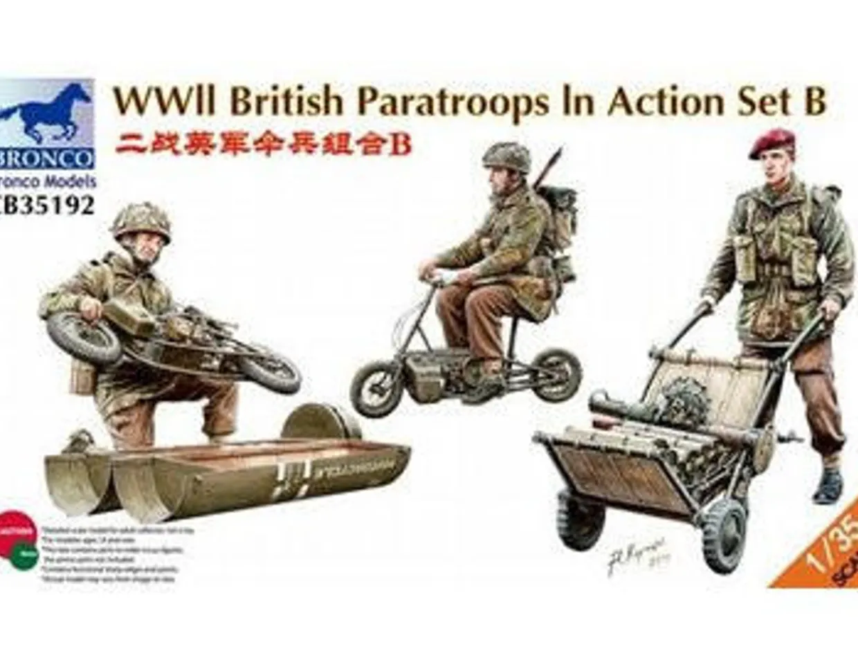 The Bronco 1/35 British Paratroops in Action Set B WWII from our 1/35 scale figure model kits range accurately recreates the real-life British airborne soldiers from World War II, equipped with miniature Welbike motorcycles. This plastic model kit requires paint and glue to complete..
