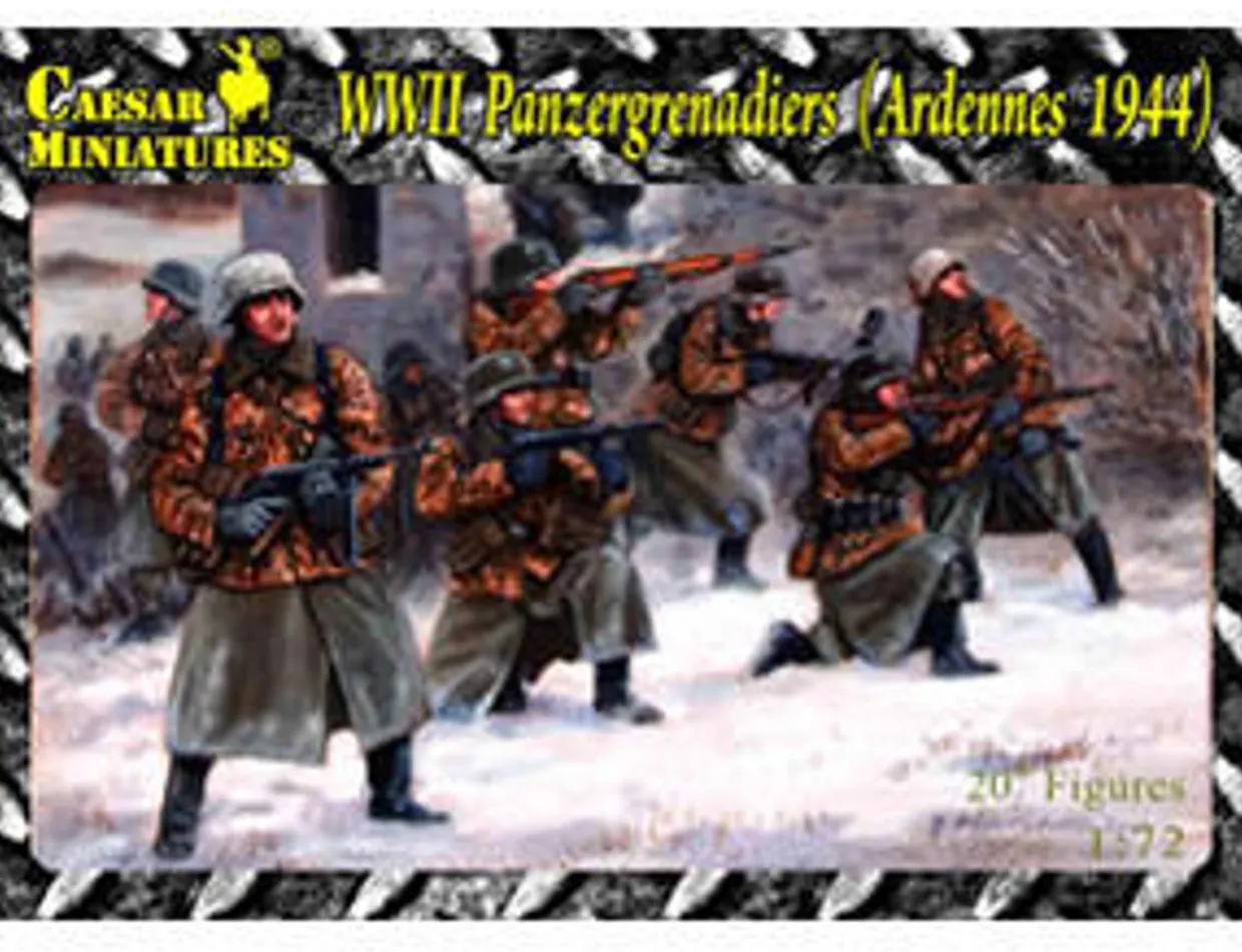 The Caesar Miniatures 1/72 German Panzergrenadiers Ardennes 1944 from our 1/72 and 1/76 scale figure model kits range accurately recreates the real-life German soldiers who fought during World War II. This plastic model kit requires paint, and may require glue, to complete.