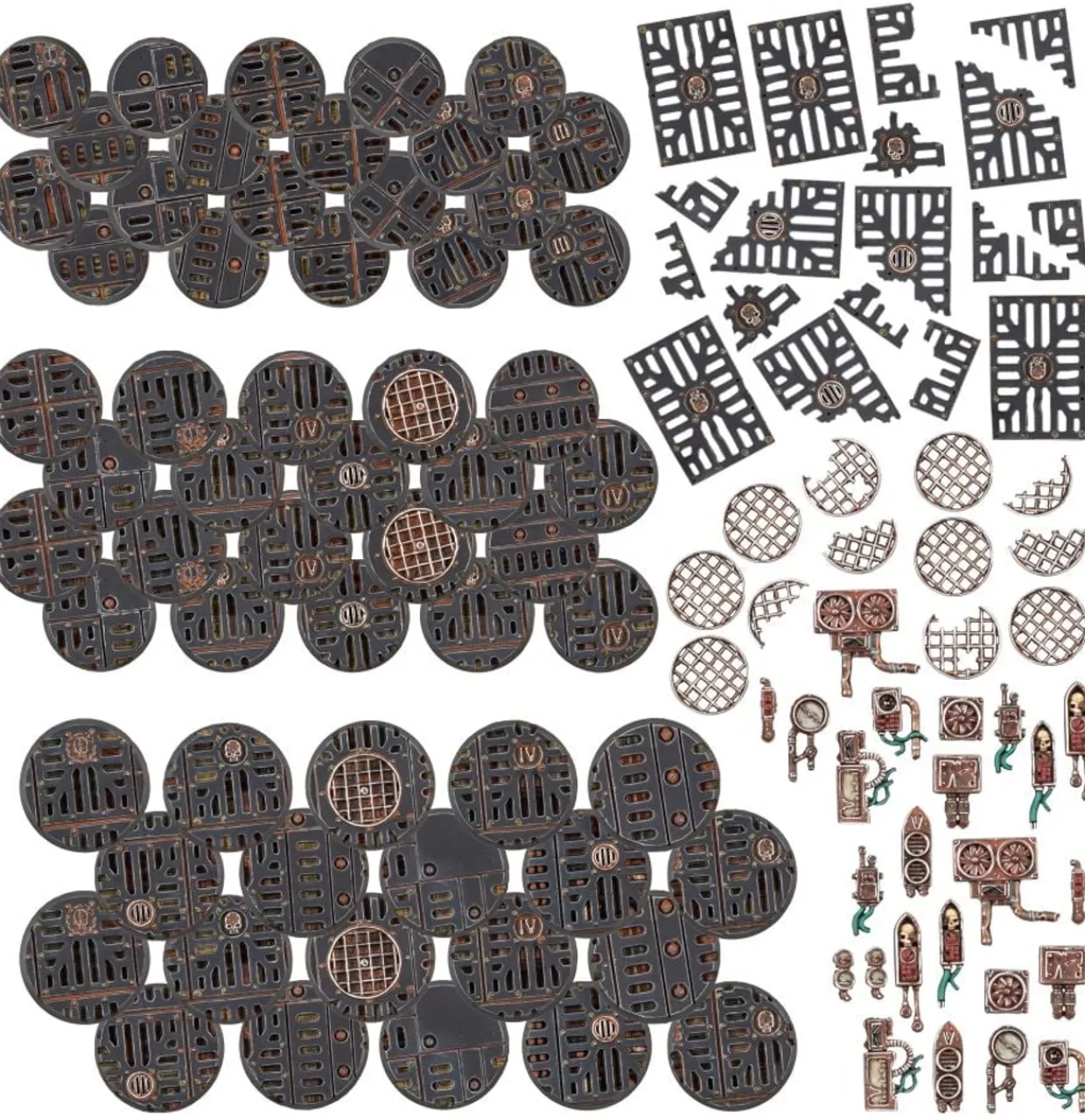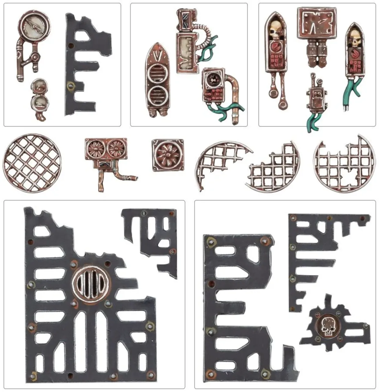 In addition to the bases, this kit contains loads pieces of grim and industrial basing material to add detail and narrative elements to your miniatures, such as gantry sections, broken grille panels, discarded fans, shattered gauges, and time-worn vox relays.