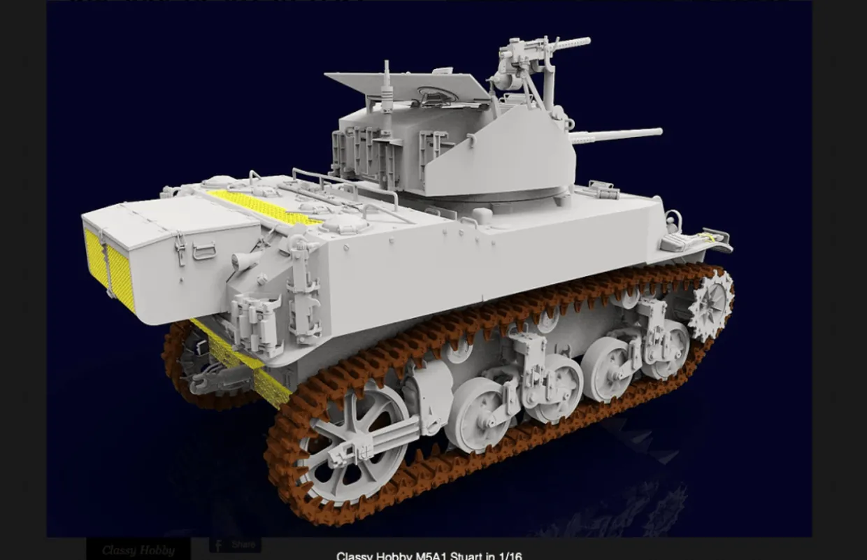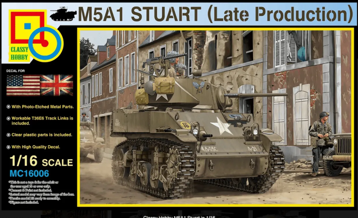 The Classy Hobby 1/16 M5A1 Stuart Light Tank Late Production from our 1/16 scale military vehicle model kits range range accurately recreates the real-life American light tank from World War II. This plastic model kit requires paint and glue to complete.