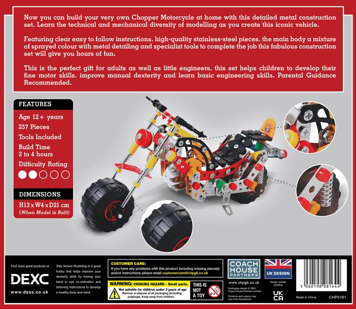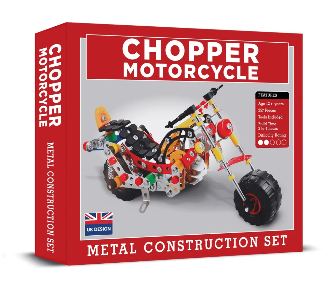 Bring the thrill of the open road into your home with the Chopper Motorcycle Metal Construction Set from Coach House Partners. This detailed kit lets you build a striking replica of the classic chopper motorcycle, combining mechanical precision with hands-on creativity.