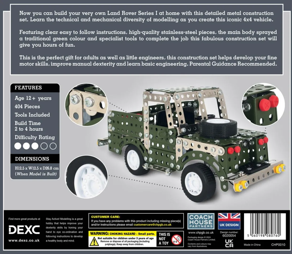 Experience the legacy of one of the most iconic 4×4 vehicles with the Land Rover Metal Construction Set from Coach House Partners. Since its original design by Maurice Wilks in 1947 and launch in 1948, the Land Rover has been at the forefront of off-road engineering, and this detailed model brings that history to life.