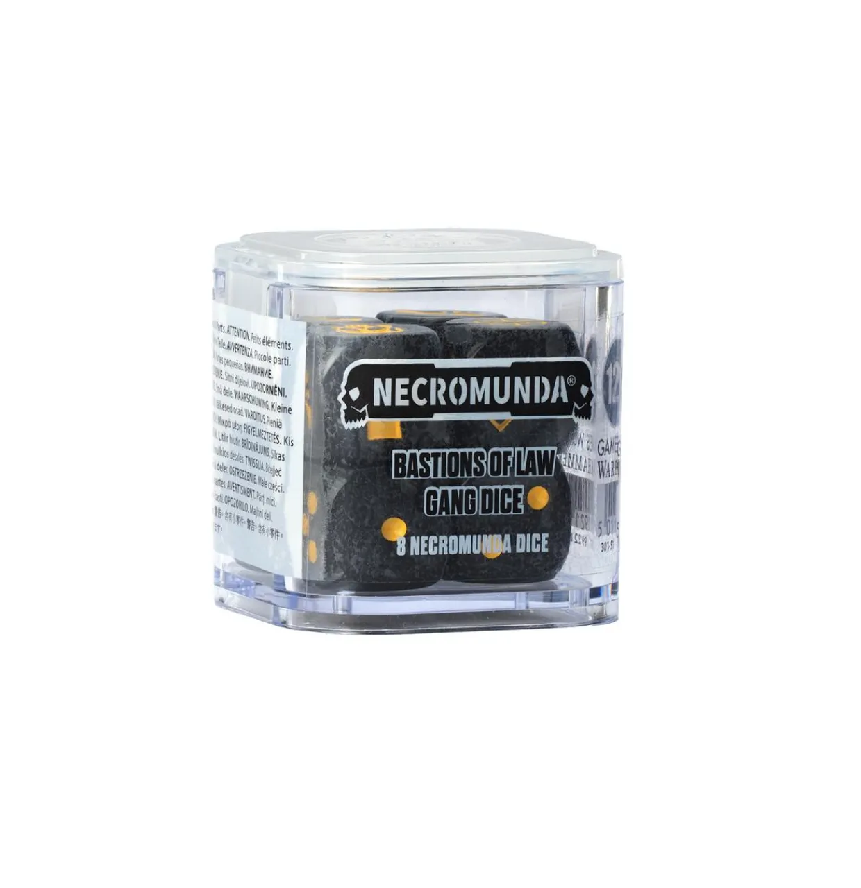 The Palanite Enforcers Necromunda Dice Set provides a set of 8 six-sided themed dice measuring 16mm along each edge. They are cast in pearlised black plastic, with yellow pips in the standard Necromunda configuration: three standard dice, two injury dice, two firepower dice, and a scatter dice.