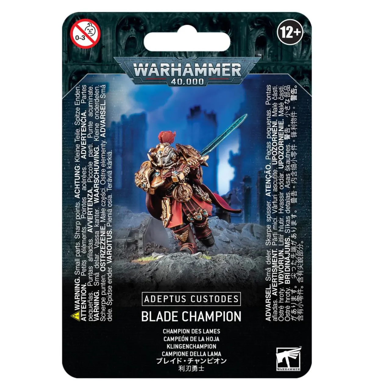 The Adeptus Custodes Blade Champion from the Warhammer 40k range provides a highly detailed character figure for use in your Adeptus Custodes army. A Blade Champion is a living weapon in the Emperors hand. His role is to identify the greatest battlefield threat be that a mighty leader, a host of killers, or a deadly war engine then to employ his archeotech blades and specialised fighting styles to ensure their swift and absolute destruction.This kit is comprised of 19 plastic components, with which you can assemble one Blade Champion model with a choice of three different head options 2x bare, one with a stoic expression and the other with gritted teeth, and 1x plumed helmet. This model is supplied with one Citadel 40mm round base. This miniature is supplied unpainted and requires assembly.