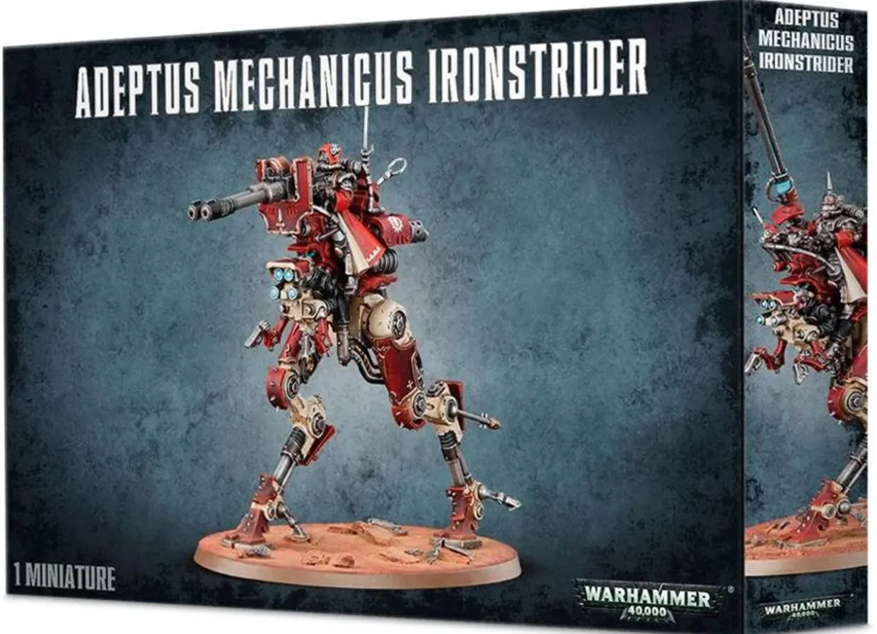 The Adeptus Mechanicus Ironstrider from the Warhammer 40k range. This multi-part, 80-component plastic kit contains all the parts necessary to build either one Ironstrider Ballistarius or a Sydonian Dragoon, and features a small transfer sheet and a 105x70mm oval base.With a distinctive two-legged walking tank-shape, the artillery platform known as the Ironstrider Balistarius is a fearsome sight indeed. Gyroscopically balanced, with downlinks providing them with the sum knowledge of their enemies, the deadly accuracy of the Ironstrider Ballistarius would be the stuff of legend, were any survivors ever left to recall it.As a mobile artillery weapons platform, the Ironstrider Ballistarius can be fitted with one of two armament options: a twin-linked cognis autocannon or a twin-linked cognis lascannon. The split-toed legs can be posed in two different configurations, with suspensors that can be modelled at differing angles, and the entire surface of the machine crawls with sensors, data collection modules and antennae. The gunner has four head options; three hooded and one rebreather.