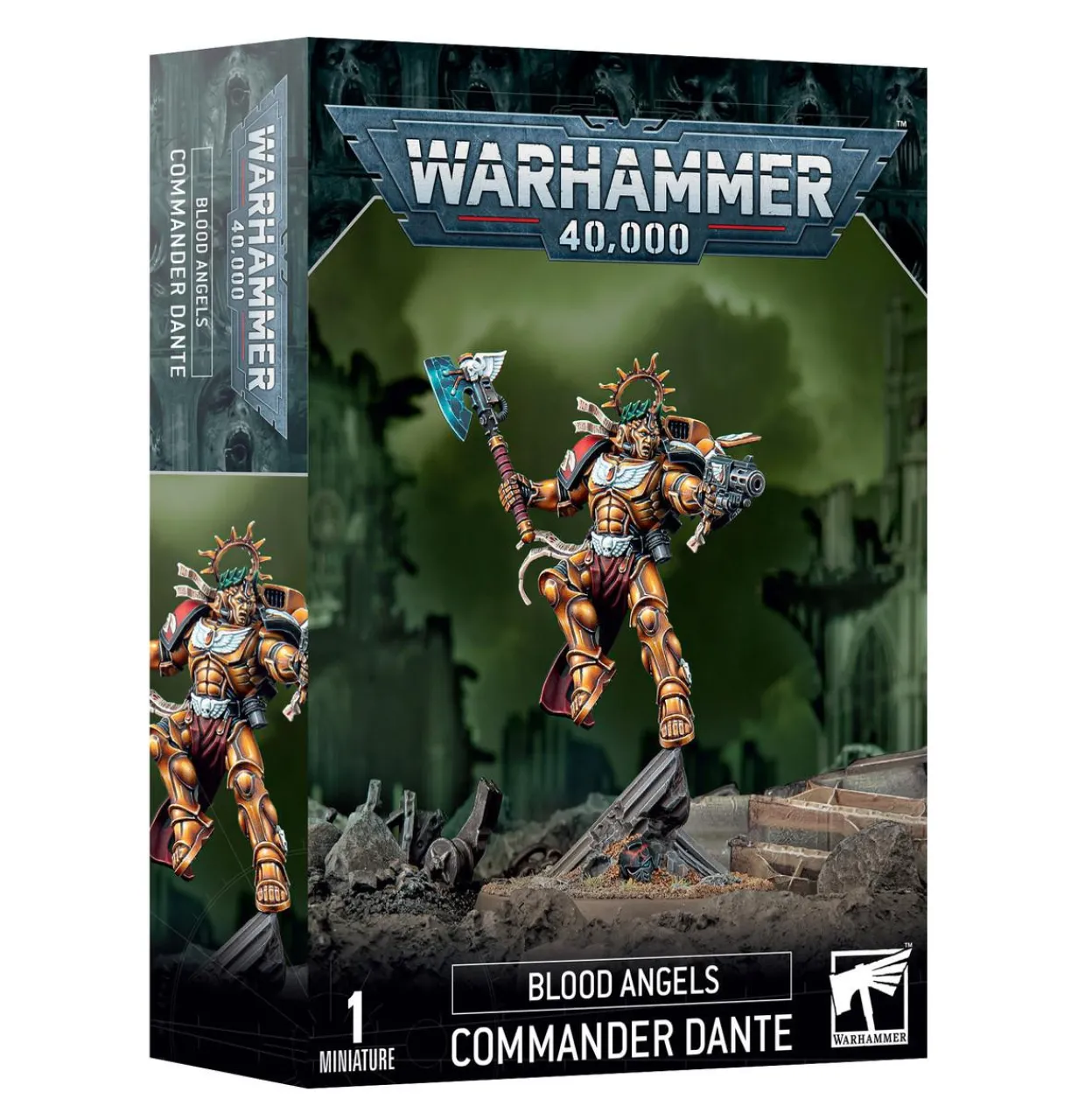 Commander Dante is among the most storied Space Marines in the Imperium, a beloved son of Sanguinius who has led the Blood Angels Chapter for more than a thousand years. Appointed by Guilliman himself as Lord Regent of the Imperium Nihilus, Dante soars over the battlefield in gleaming golden armour. Once in the fray, the piercing gaze of his death mask freezes enemies with unnatural fear, even as he cuts down foe after foe with perfect strikes from the Axe Mortalis.
