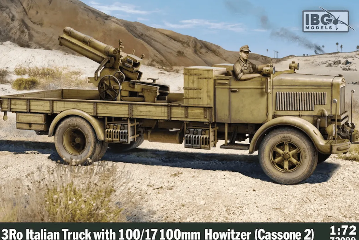 The IBG 1/72 3Ro Truck with 100/17 100mm Howitzer (Cassone 2) from our 1/72 and 1/76 scale military vehicle model kits range range accurately recreates the real-life Italian truck-mounted artillery use during World War II. This plastic model kit requires paint and glue to complete.
