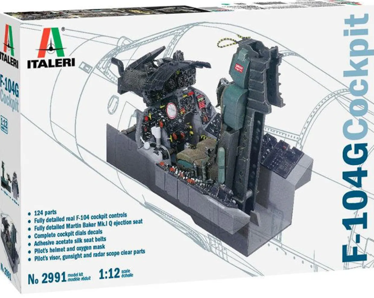 The Italeri F104G Cockpit in 1/12 scale from the plastic aircraft model range accurately recreates the real life Starfighter cockpit. This plastic model kit requires paint and glue to complete.