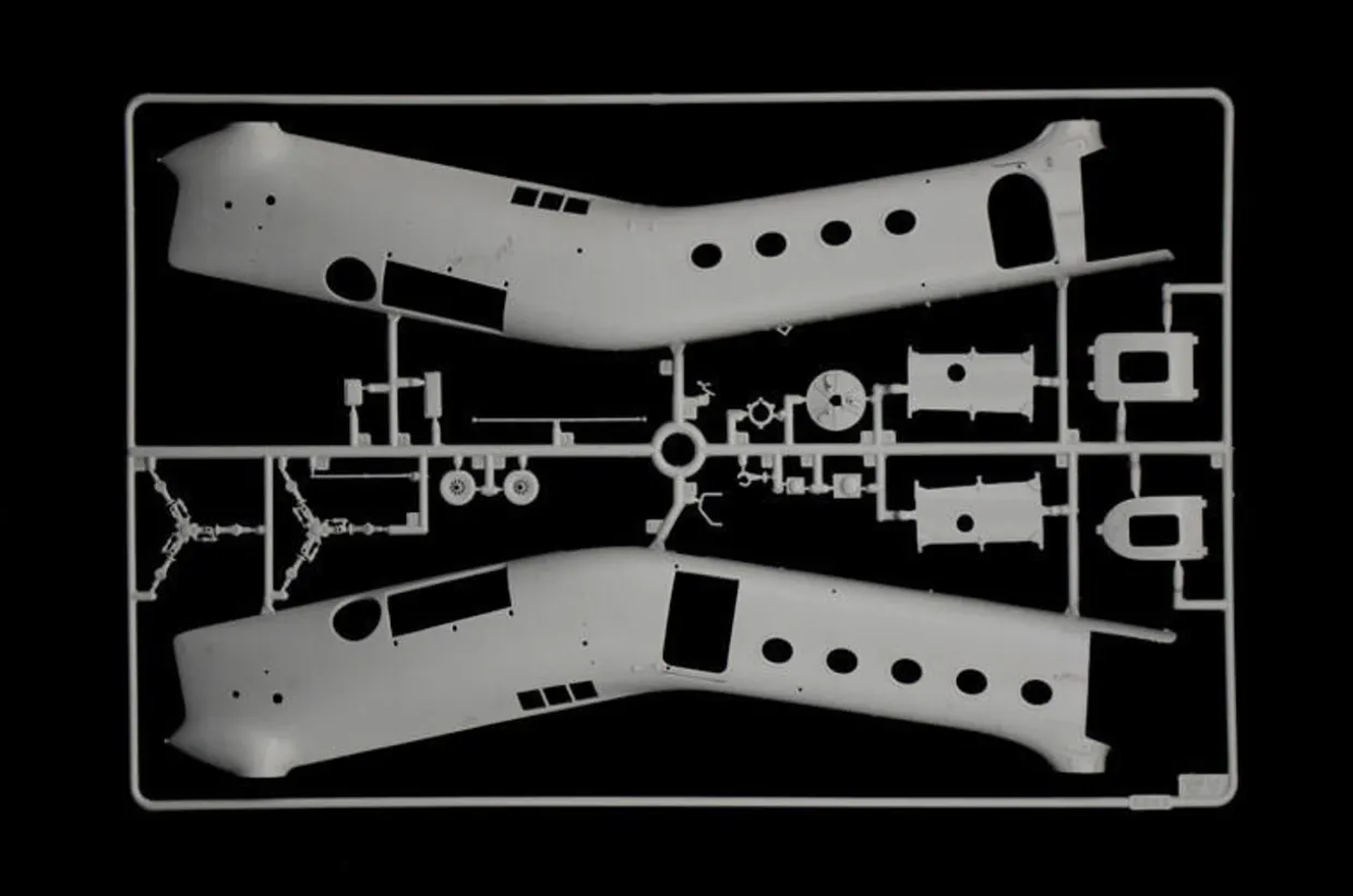 The H-21 Shawnee helicopter is best known for its nickname “the flying banana”, which derives from the peculiar upward angle of the aft fuselage. This plastic model kit requires paint and glue to complete.