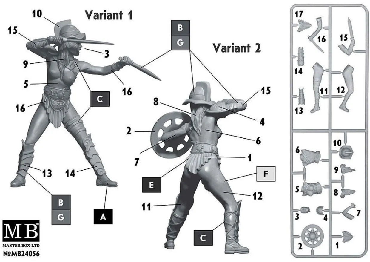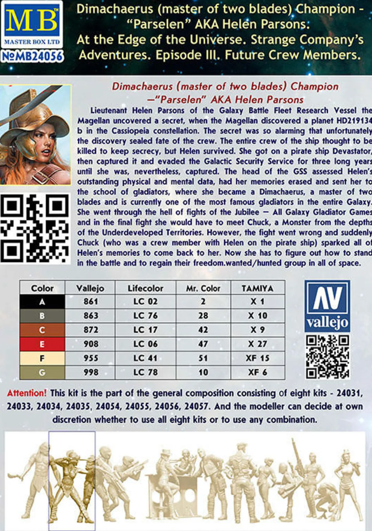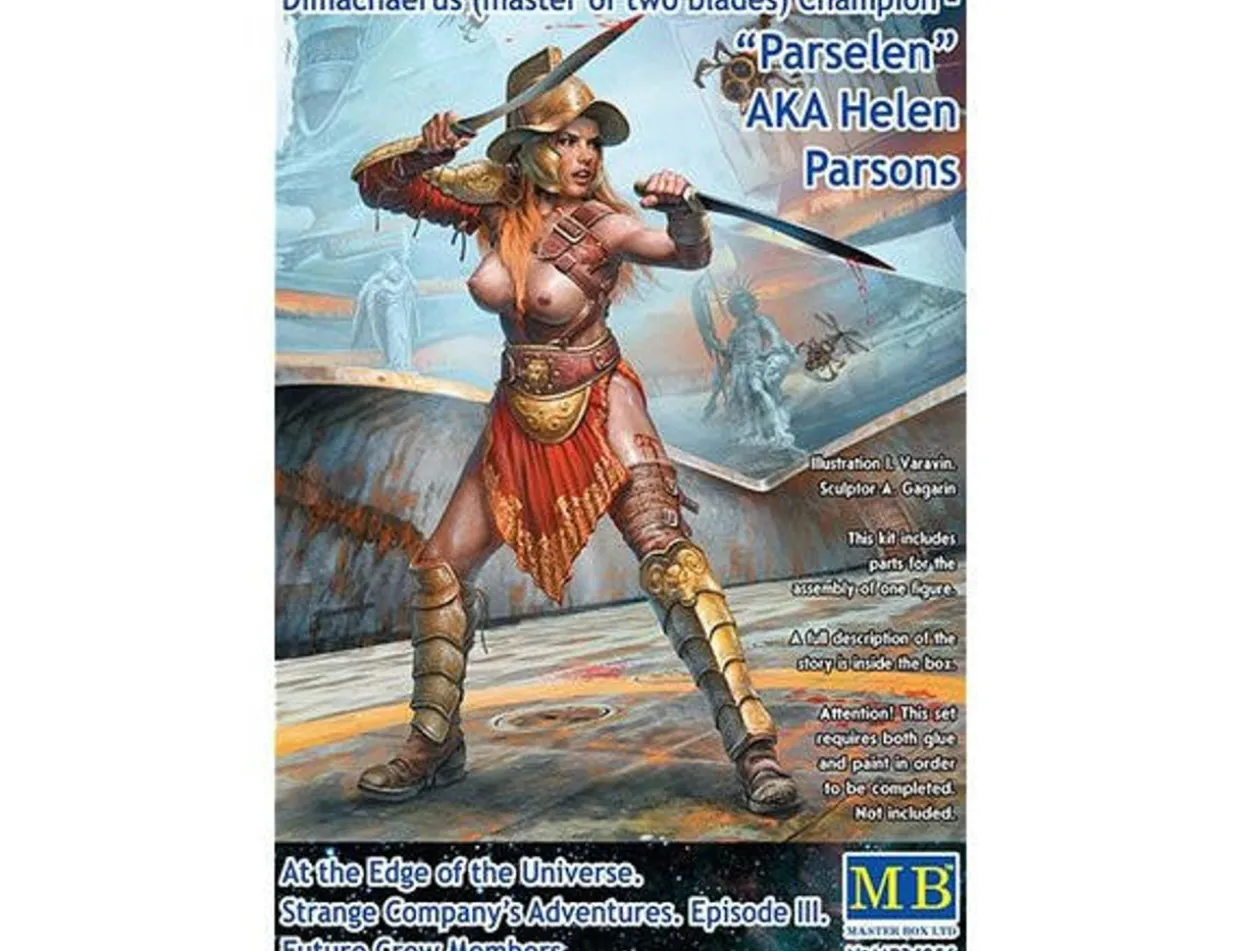 The Master Box 1/24 At the Edge of the Universe Dimachaerus (Master of Two Blades) Champion Parselen AKA Helen Parsons from our 1/24 scale figure model kits range provides a highly-detailed science fiction figure. This plastic model kit requires paint and glue to complete.