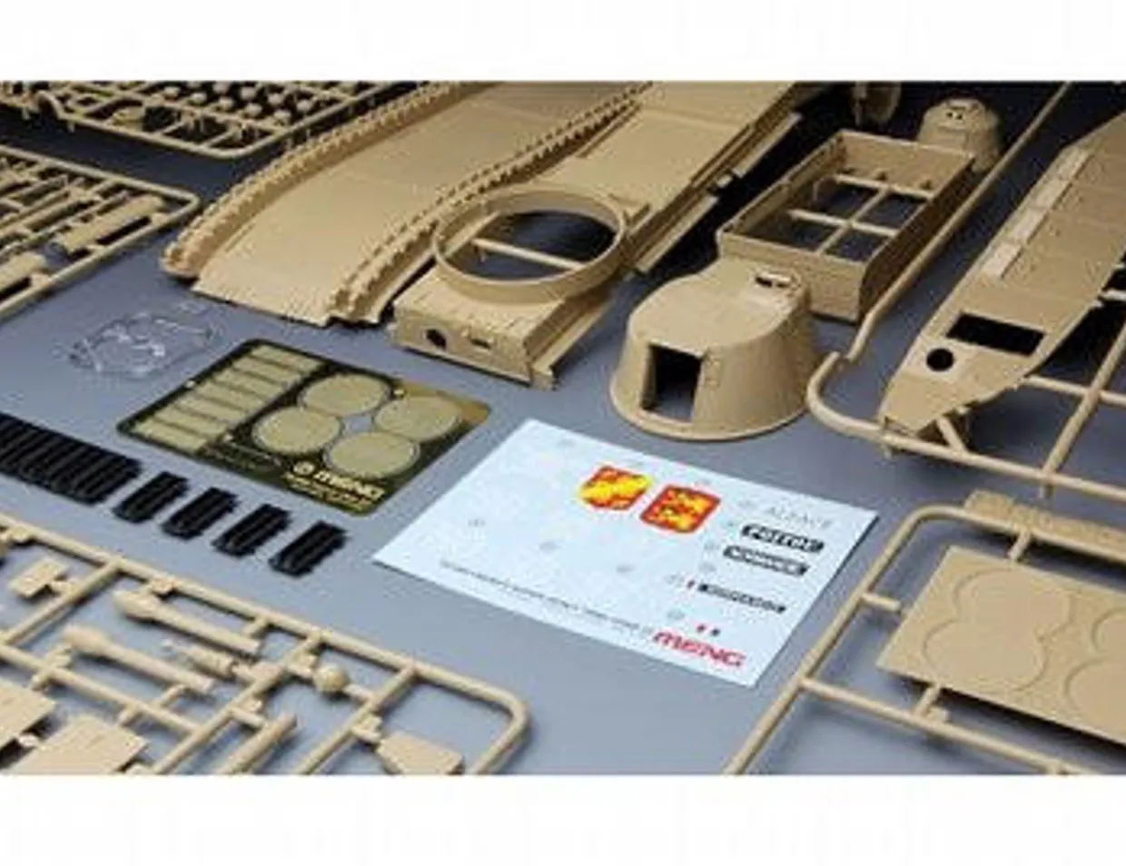 - The kit contains tan-colored sprues, black track parts, one clear sprue, one PE fret and one decal sheet.