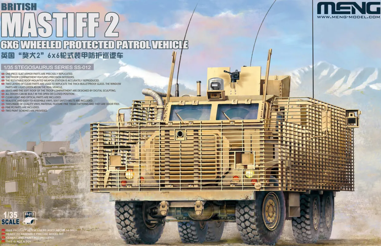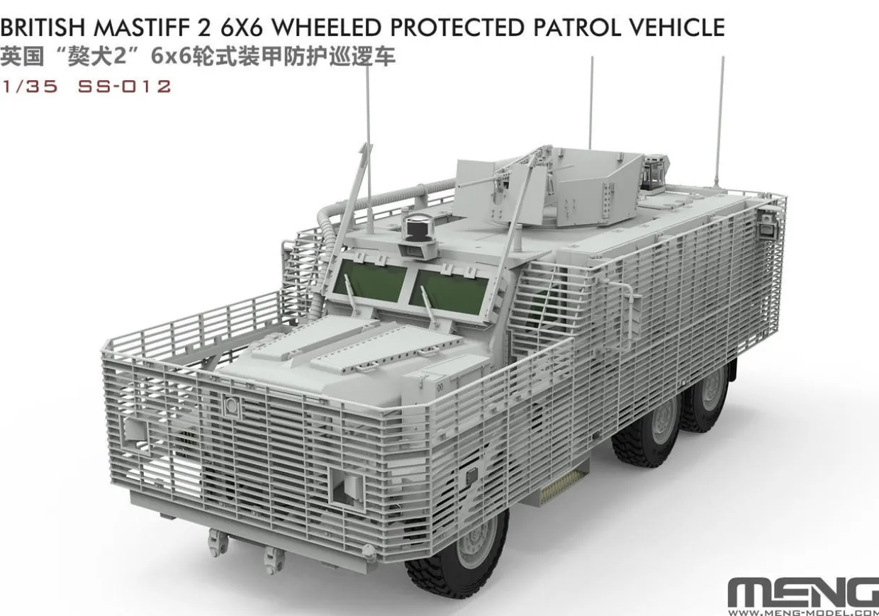 The Meng Models 1/35 Mastiff 6×6 Patrol Vehicle British Army from our 1/35 scale military vehicle model kits range range accurately recreates the real-life British armoured troop carrier. This plastic model kit requires paint and glue to complete.