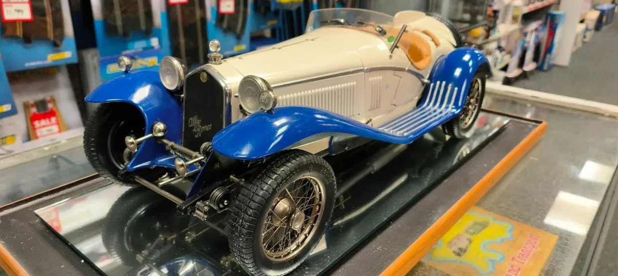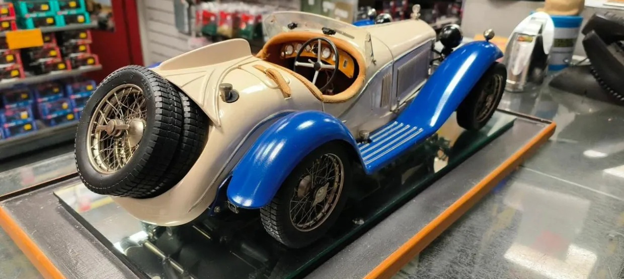 The Pocher 1/8 1932 Alfa Romeo Spider Touring Gran Sport is a Ready Assembled kit that includes a fantastic mirrored base display case.