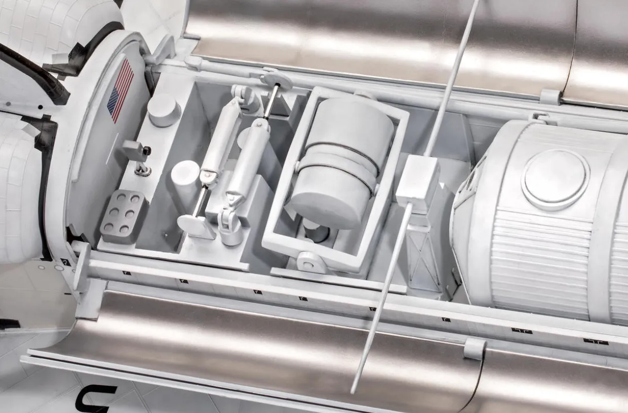 The NASA reusable space transport system is now getting on in years and will shortly be replaced by a more up-to-date system. The total weight of the space shuttle ready for take-off is 2055 tonnes. It can carry a payload of 300 tonnes in an orbit up to a height of 965 km above the earth and is in active service as means of transport for many research missions. The Discovery took off for the first time on 30th August 1984. It is also in continuous use by the shuttle flights engaged in the construction of the international space station ISS. The special features of the large model space shuttle include a detailed cockpit anddetailed cargo compartment with movable hatches.
