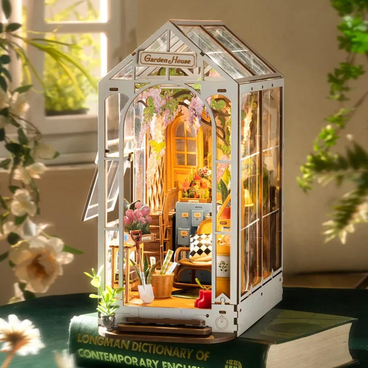 The Rolife Holiday Garden House 3D Creative Bookend from the wooden models range is a DIY bookshelf decoration in form of a miniature greenhouse. This 3D Wooden Diorama requires paint and glue to complete.