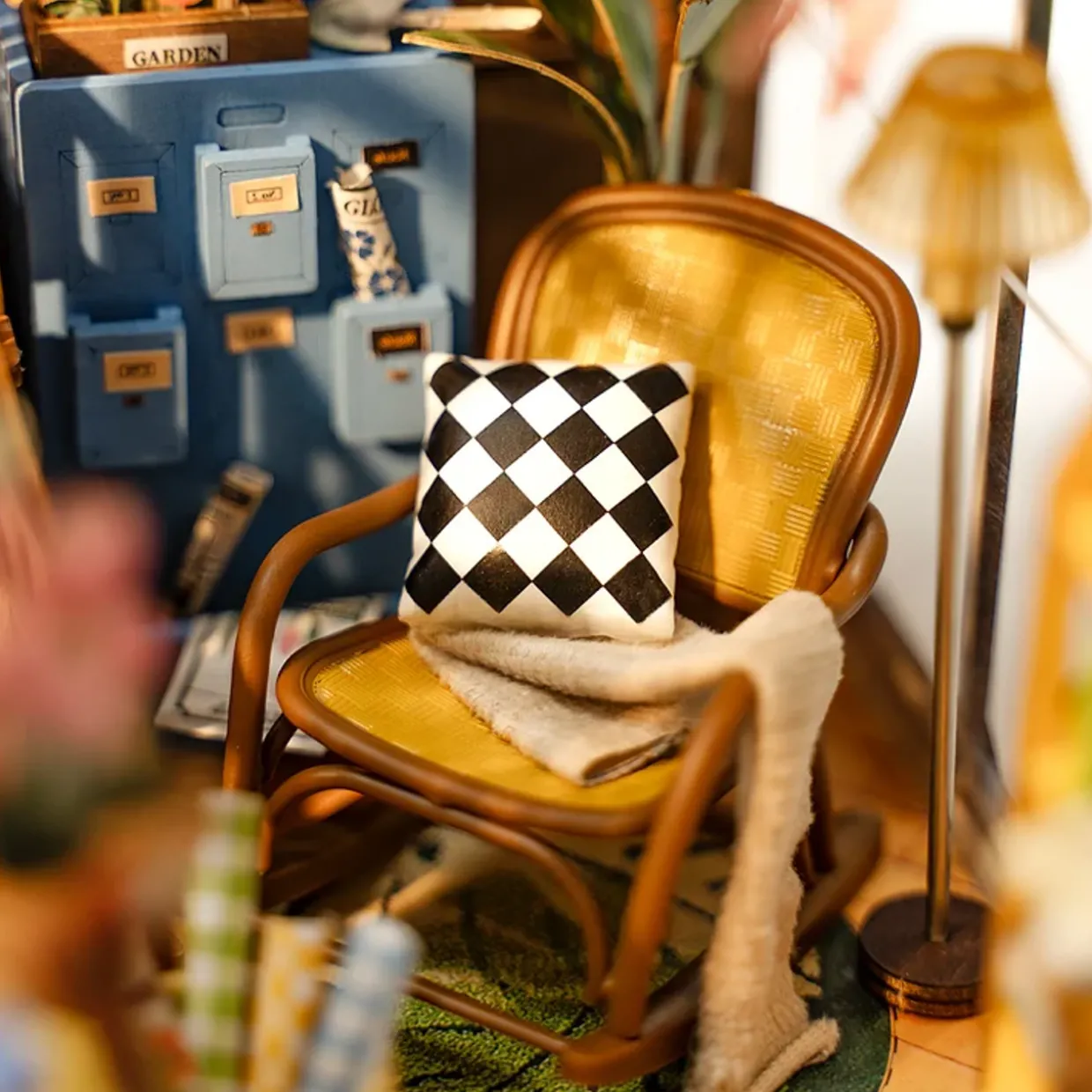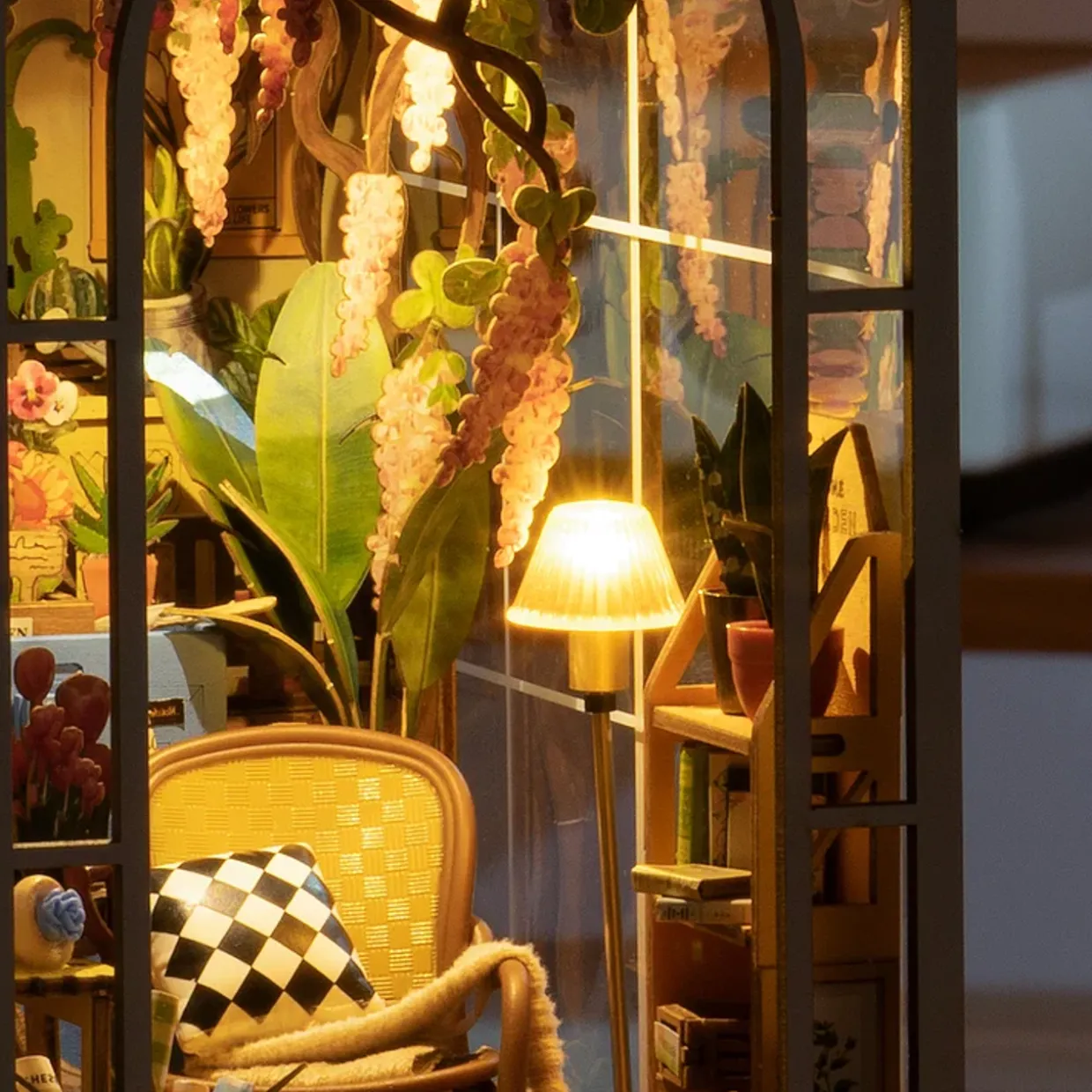Experience the assembly of our Garden House DIY book nook kit, where French elegance meets rustic charm, featuring vibrant stained glass, a curved staircase, side-opening windows, touch-sensitive night lights, and beautiful wisteria vines.