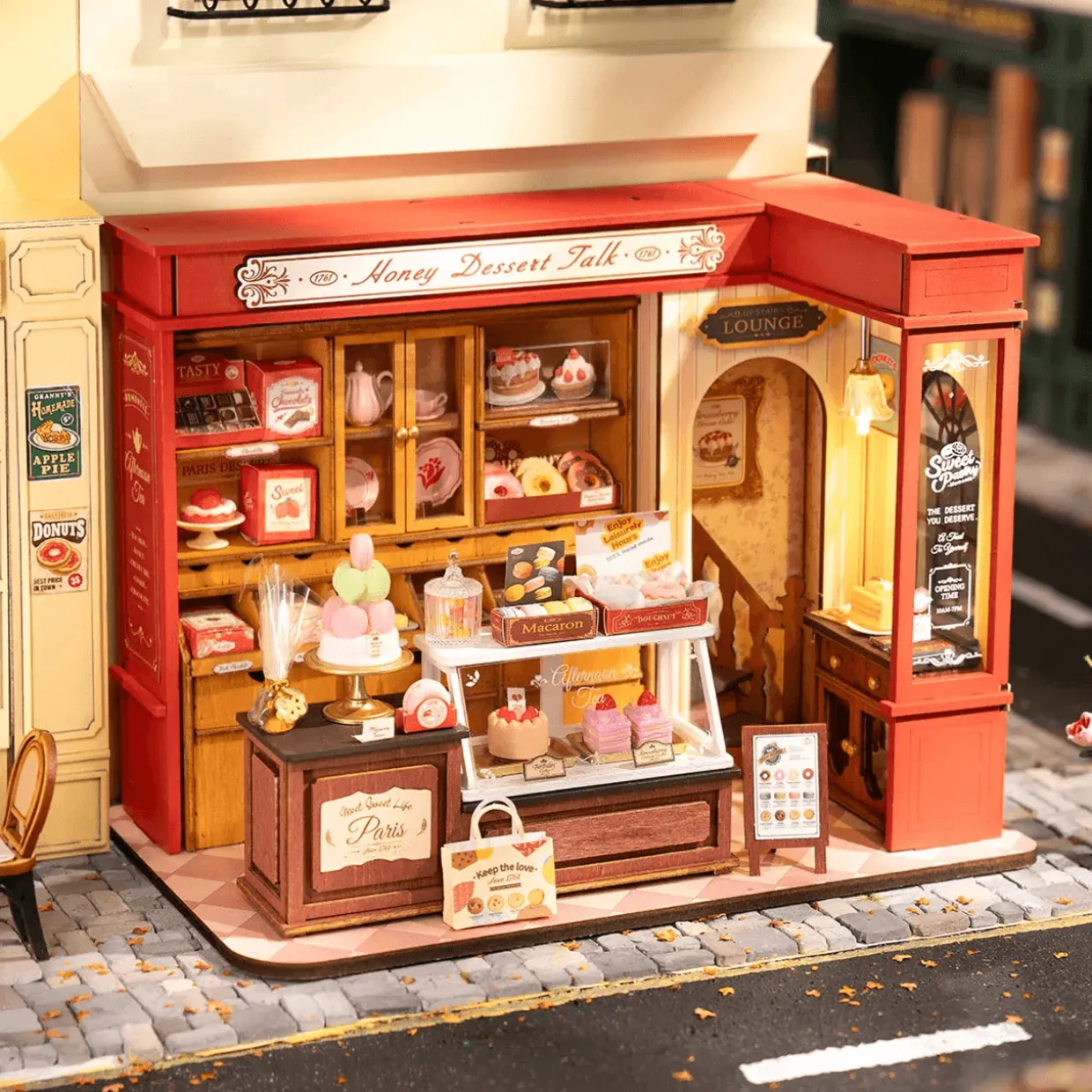 It’s time for tasty treats from Honey Dessert Talk, a sweet and stylish French patisserie by Rolife. This DIY miniature is filled with delectable creations artfully displayed in charming glass cases and wooden shelves. Add this adorable model to your miniature house collection today!