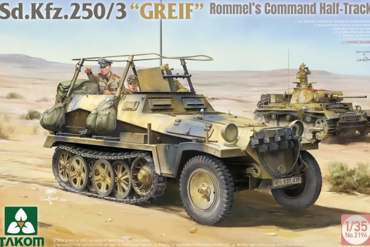 The Takom 1/35 German Army SdKfz 250/3 “Greif” Rommel’s WWII Half-Track Vehicle from our 1/35 scale military vehicle model kits range range accurately recreates the real-life German Half-Track used by Rommel during World War II. This plastic model kit requires paint and glue to complete.