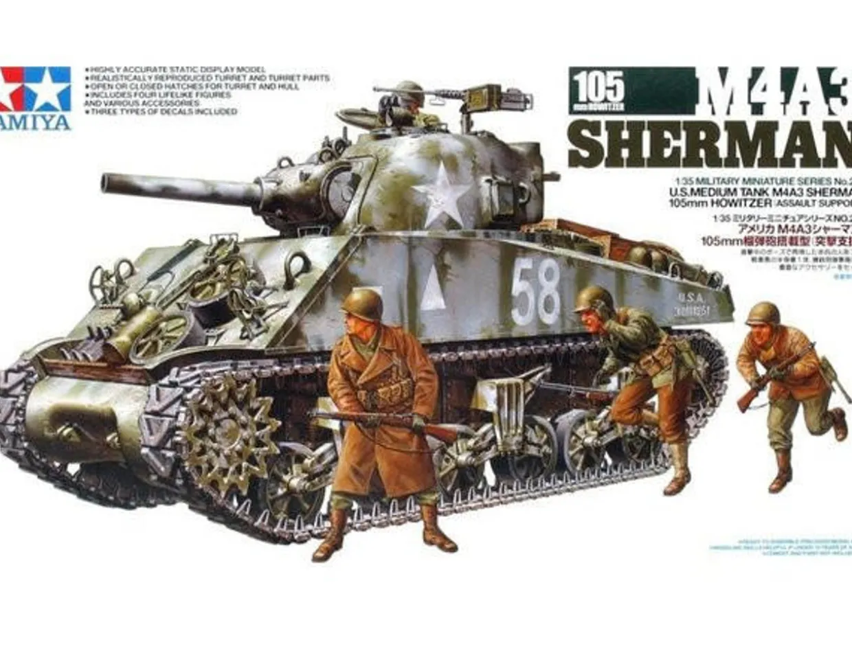 The Tamiya 1/35 M4A3 Sherman with 105mm from our 1/35 scale military vehicle model kits range range accurately recreates the real-life US medium tank from World War II armed with the 105mm howitzer. This plastic model kit requires paint and glue to complete.