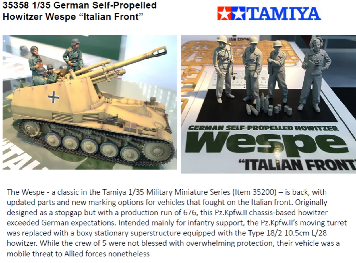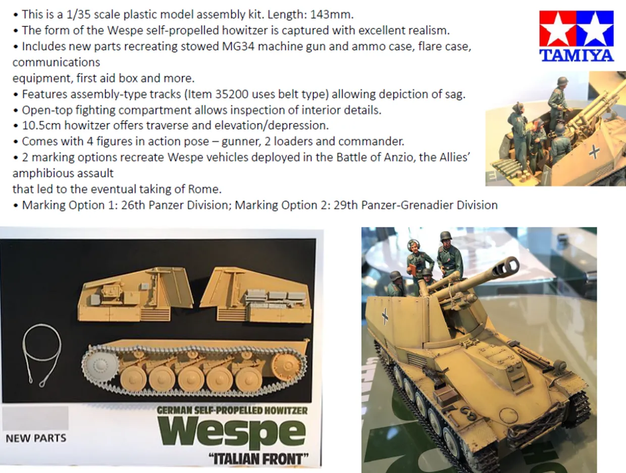The Tamiya 1/35 Sd.Kfz.124 Wespe SPG Italian Front from our 1/35 scale military vehicle model kits range range accurately recreates the real-life German self-propelled howitzer from World War II. This plastic model kit requires paint and glue to complete.