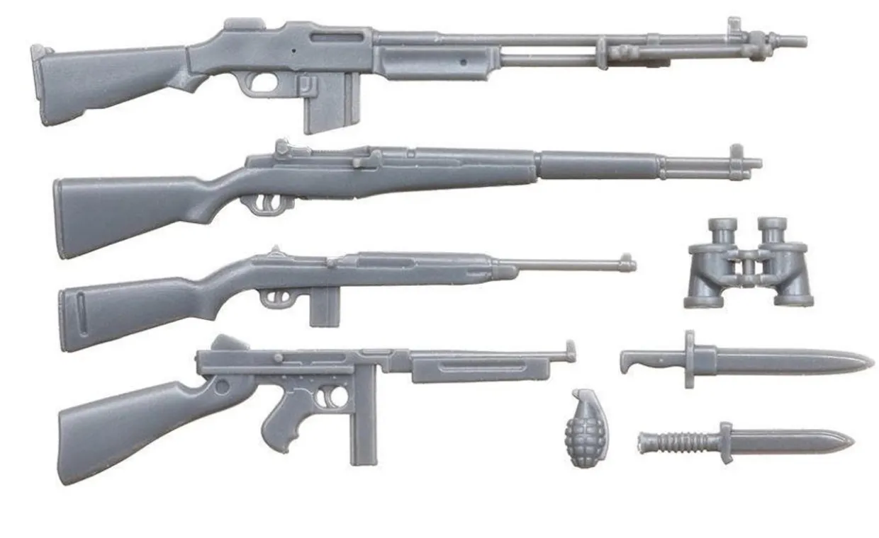 These figures depict the commander looking ahead with M1 Carbine in hand, two soldiers with M1 Garand and BAR, one soldier with the Handie Talkie (Thompson submachine gun on the ground) and a rifleman down on one knee.