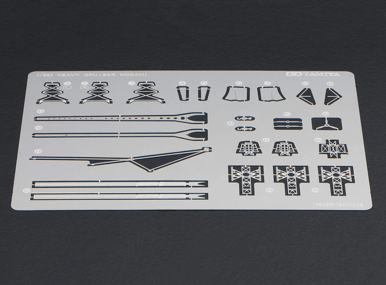The Tamiya 1/350 Japanese Heavy Cruiser Mogami is a plastic model kit in the Tamiya 1/350 Ship Plastic Model Kits range. This plastic model kit requires paint and glue to complete. The First Fleet Replenish Program of 1931 gave Japan a special allowance to build 50,955 tons worth of new light cruisers armed with 6-in guns. Construction of the new fleet began at Kure Naval Arsenal with the Mogami. The original Mogami was equipped with 5 triple 15. 5cm gun turrets, 4 triple 61cm torpedo launchers, 4 twin 12. 7cm gun mounts, protection against 8-in. shells, 4 twin 25mm guns, and 2 twin 13mm machine guns. The cruiser held all of this equipment within the 8,500-ton displacement limit. When naval treaties were removed, the ship was outfitted with 20. 3cm gun turret, which caused the ships to be top-heavy and unstable. The Mogami underwent numerous reinforcement modifications such as hull strengthening, resizing of the bridge, and repairing cracks and hull plate. The Mogami was involved in the WWII invasion of Java at Bantam Bay, the Indian Ocean raids in the Bay of Bengals, Midway Invasion, and was defeated by a torpedo from Akebono off the coast of the Panaon Islands.