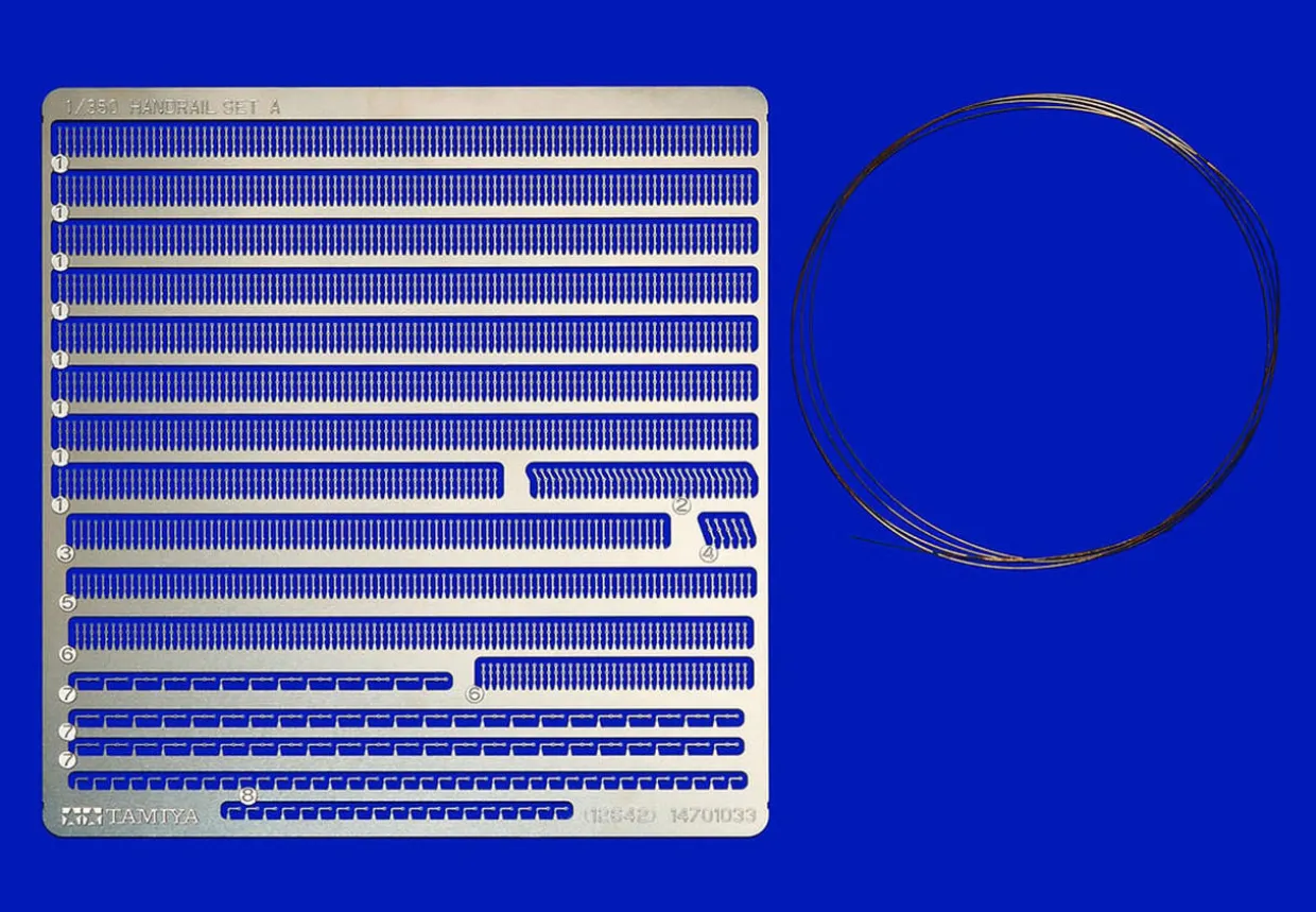 The Tamiya Photo-Etch Handrail Set A in 1/350 scale from the model ship accessories range provides accurately reproduced hand-rails in super detail. This set includes 8 different kinds of photo-etched handrail posts, through which metal wires (0. 1mmdia. ) are passed to depict deck handrails. Set can also be used for Item 78025 1/350 scale Yamato as well as other 1/350 scale WWII Japanese Navy ship models.