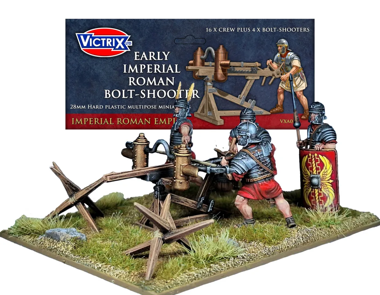 The Victrix 28mm Early Imperial Roman Bolt-shooters from our 1/56 (28mm) scale figure model kits range accurately recreates the real-life soldiers. This plastic model kit requires paint, and may require glue, to complete. This set includes 4 bolt-shooters and 16 crew figures.