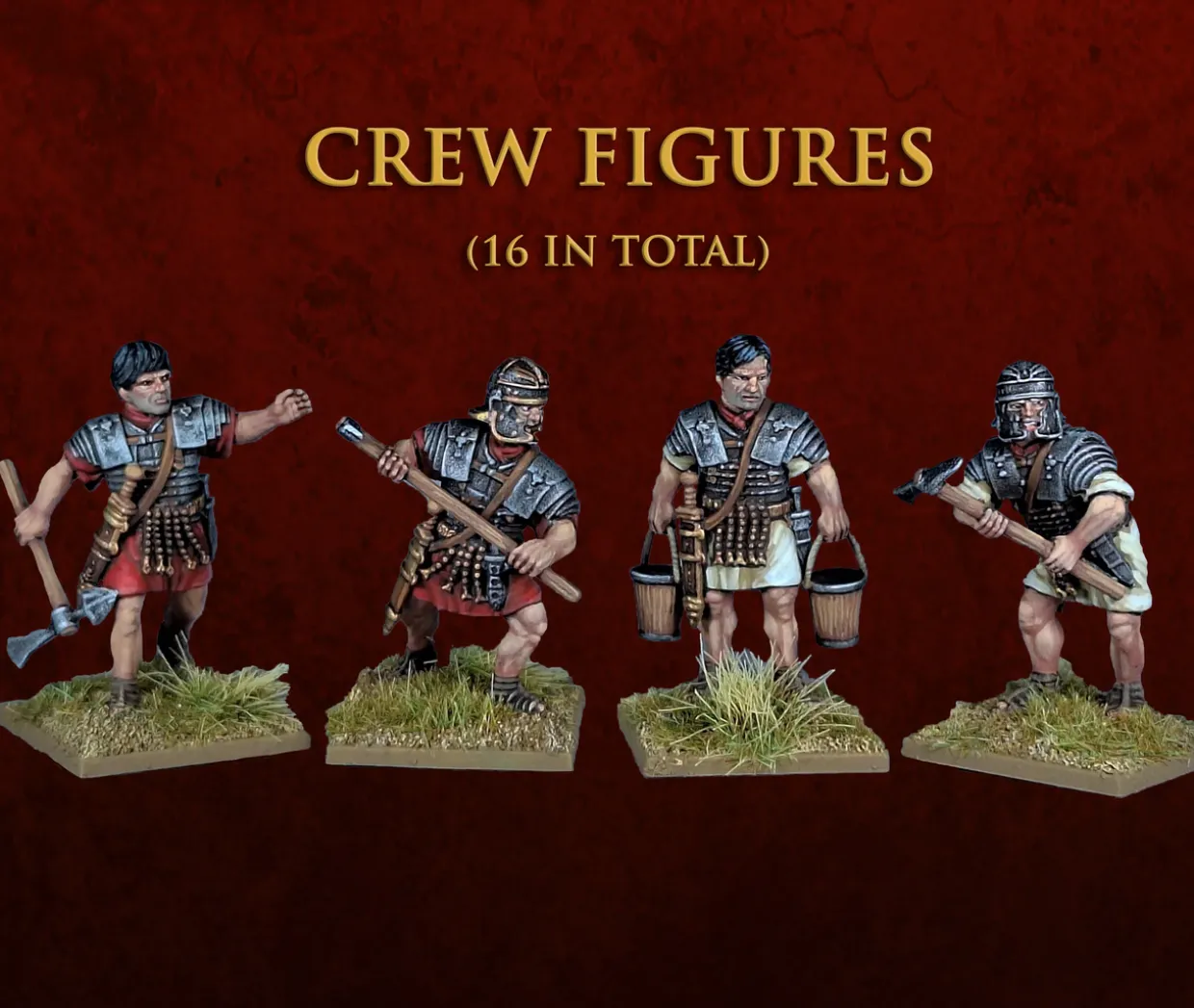 - 16 x crew figures in various poses. Ratcheting back the hand cranks, loading the bolts, standing guard. We even have arms with picks, axes and buckets so you can use them as Romans building and entrenching.