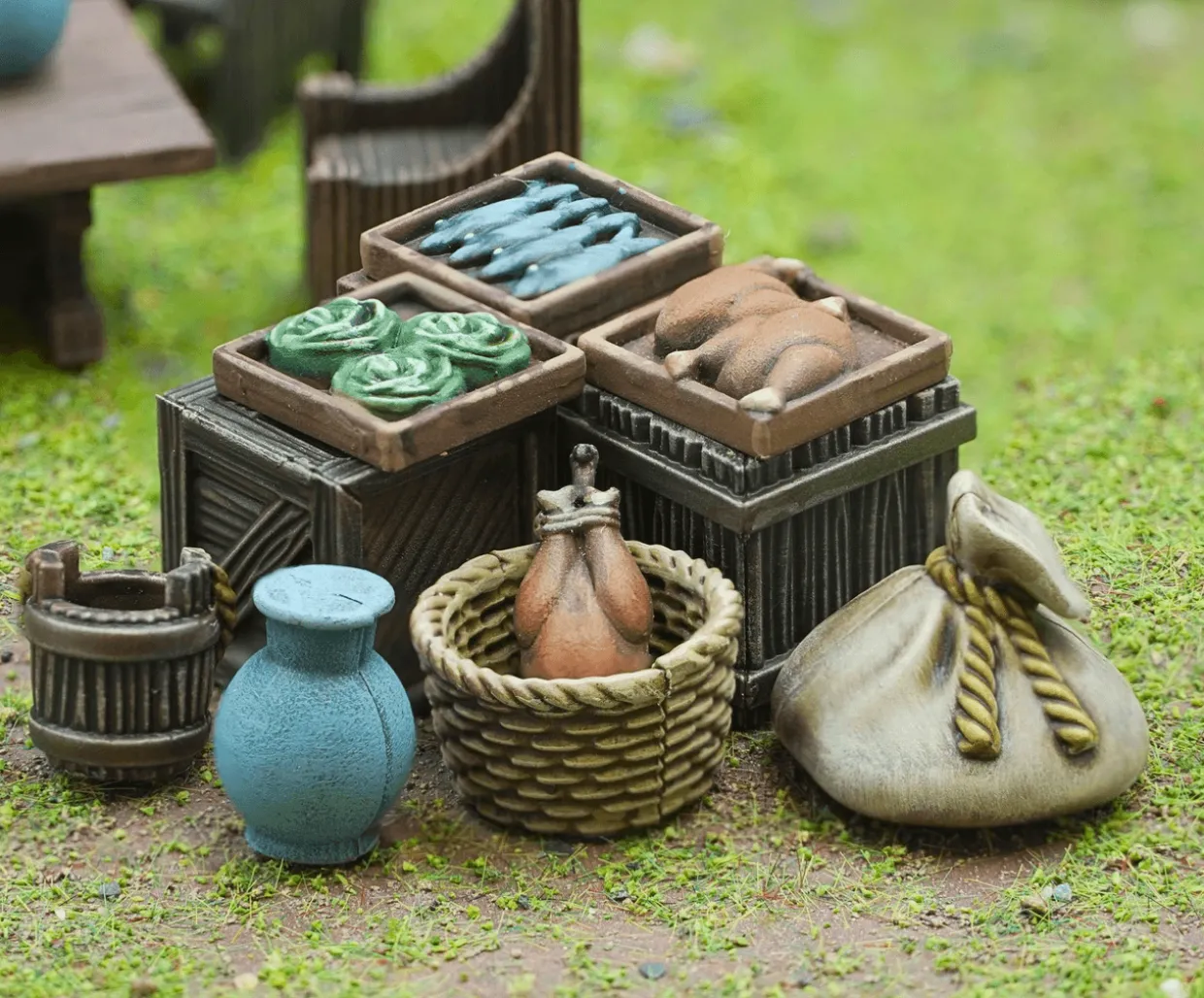 This clever (if we do say so ourselves!) hard plastic set features two unique frames that can be assembled to create 8 barricades. OR the same components (minus the barricade bases) can be built as a full marketplace including covered stalls, trestle tables, chairs, chests, buckets, baskets, barrels, sacks, pots, crates, and a variety of food stuffs!