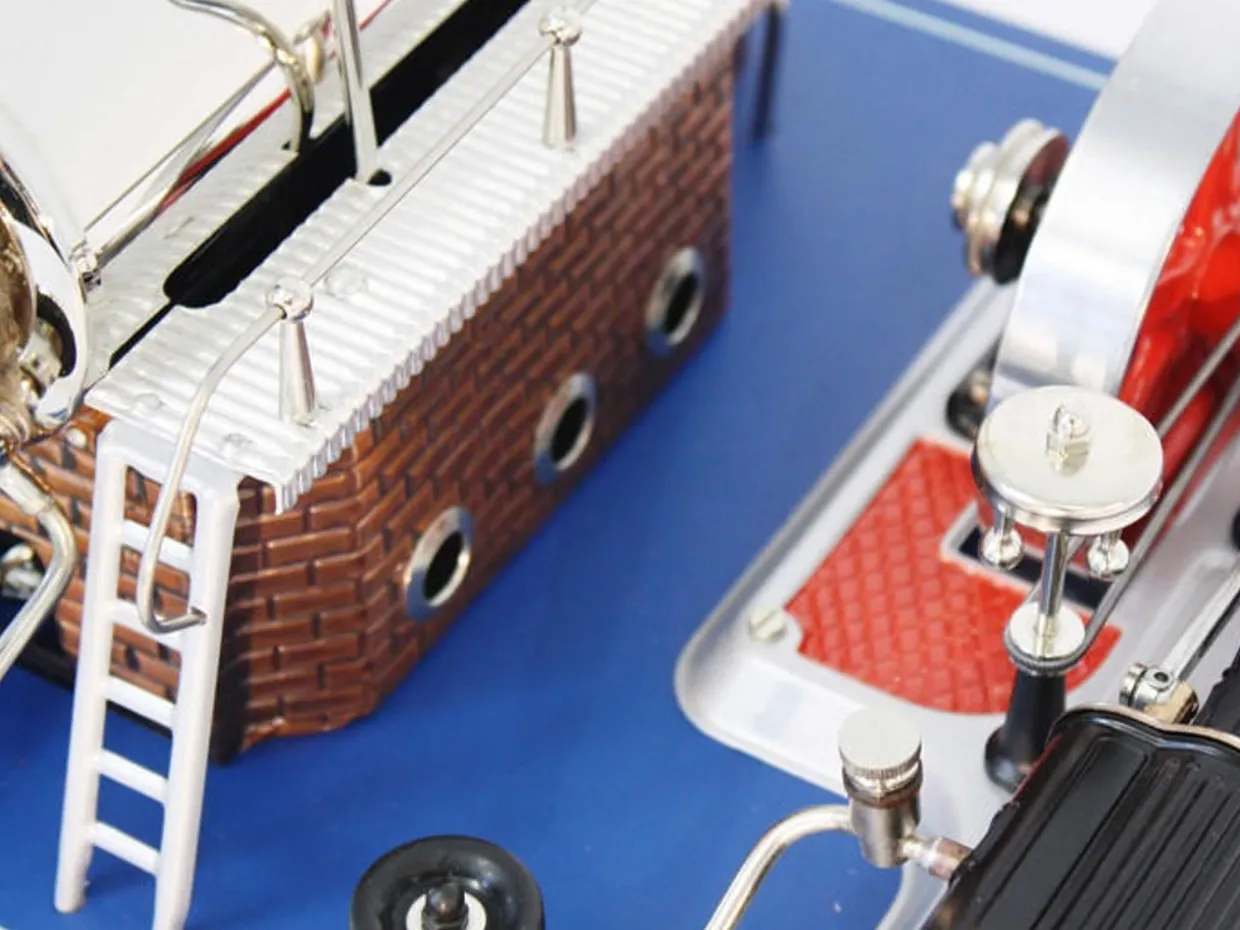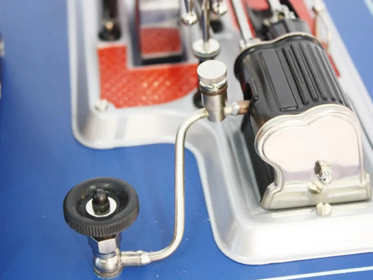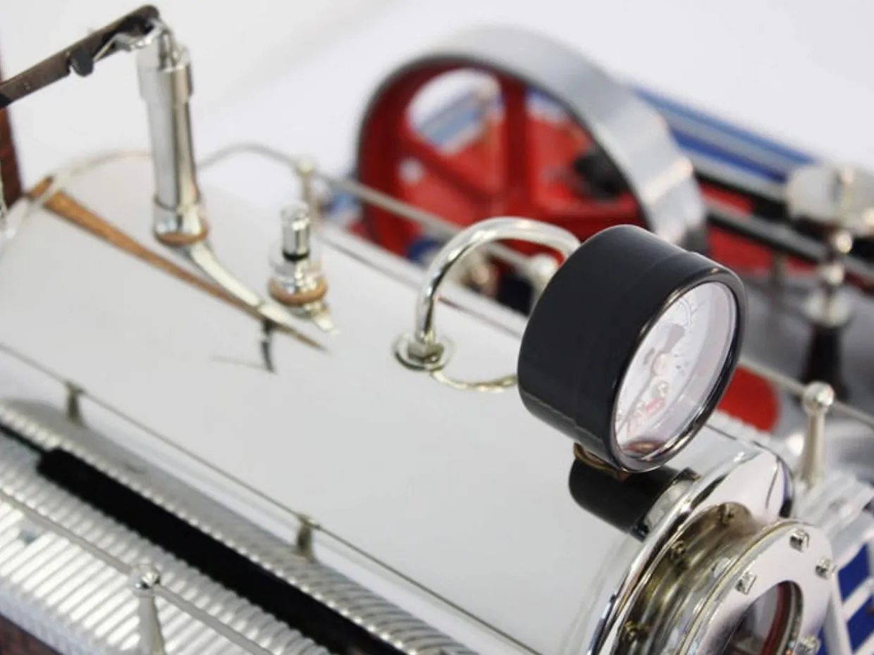 The Wilesco D20 Steam Engine has a mirror polished and nickel plated boiler, with a diameter of 2.6″, length 6.5″, boiler capacity 30.5 in, with water gauge glass, water drain cock.
