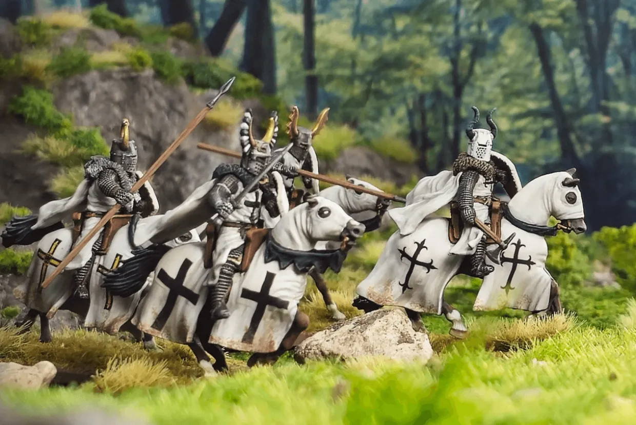 This set contains 12 fantastically detailed miniatures with a huge array of helmet and cloak options. There are helmets with ornate horns and wings and some plainer styles without decoration so the choice is yours. There is also a sheet of Teutonic barding and shield transfers to decorate your miniatures from Little Big Men Studios. These are purchased separately.