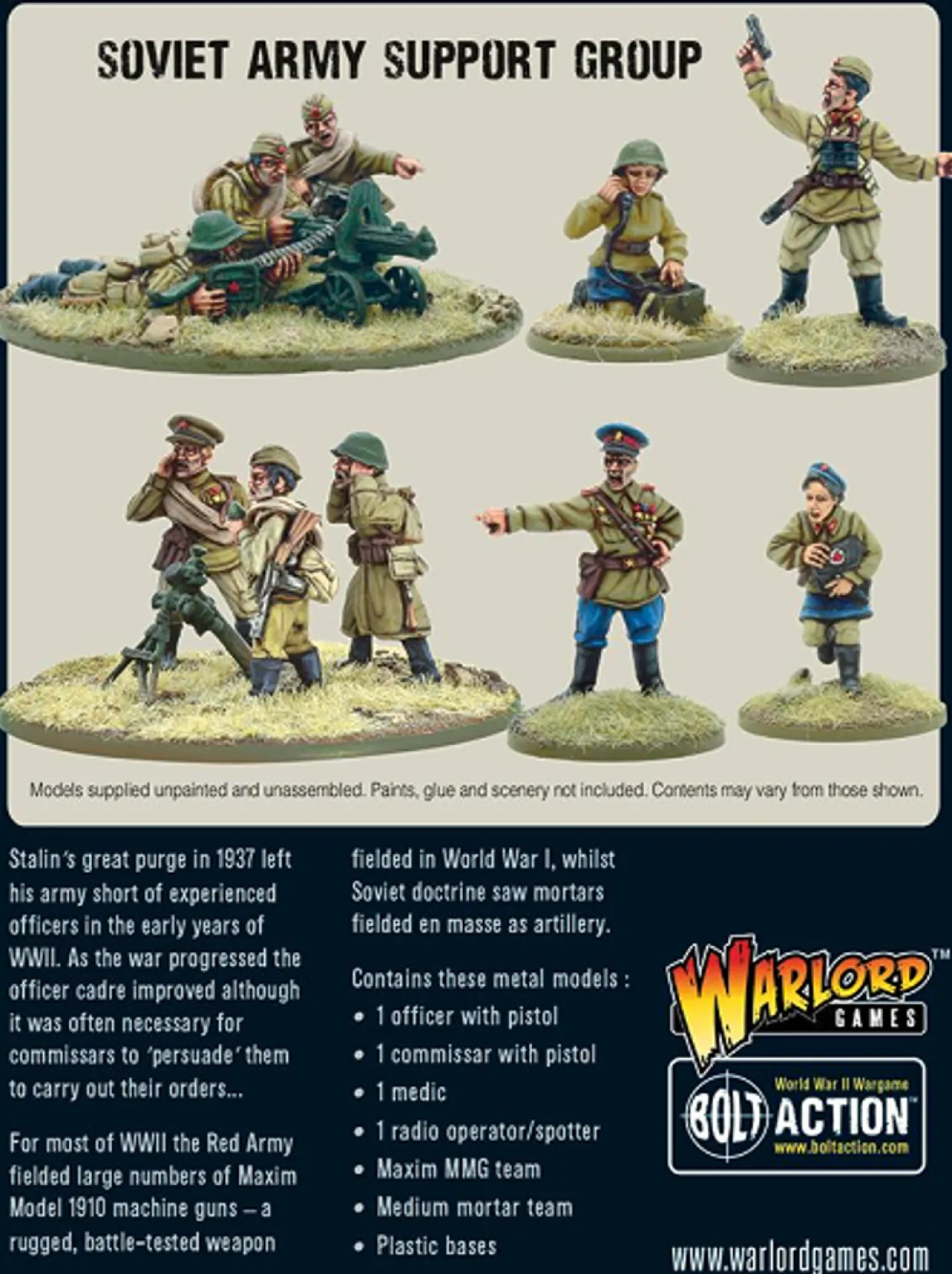 The Warlord Games 28mm Bolt Action WWII Soviet Army Support Group from our 1/56 (28mm) scale figure model kits range accurately recreates the real-life soldiers. This metal model kit requires paint, and may require glue, to complete. Box includes 10 metal figures.